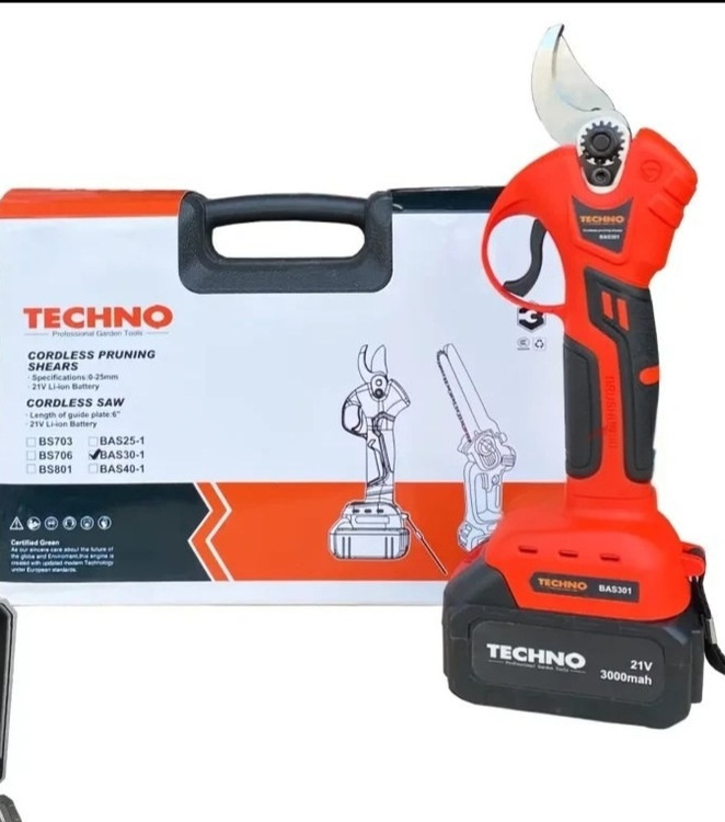 قیچی باغبانی شارژی برند تکنو ۳ سانت مدل bas30-1 دوباطری بزرگ ۳۰۰۰ میلی امپر (گیربکس ژاپن) کپی