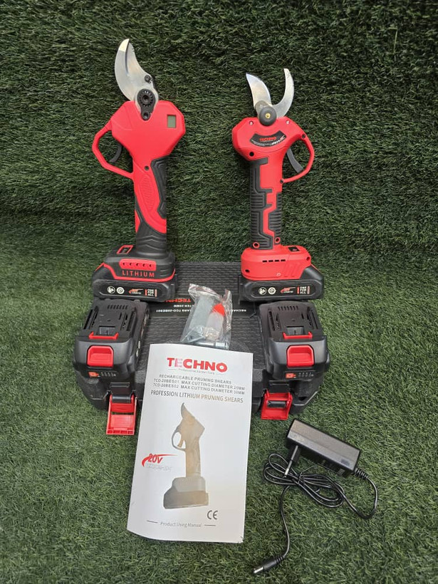 قیچی شارژی تکنو TECHNO با تکنولوژی ژاپن و موتور ژاپنی ساخته شده است. دارای کیفیتی فوق العاده عالی هستند. این قیچی های شارژی TECHNO شاخه هایی تا قطر ۲/۵سانتی متر به راحتی برش می دهد. باطری این قیچی شارژی 21 ولت و 2 امپر است. قیچی شارژی TECHNO دارای یک جعبه حمل و دو عدد باطری و شارژر و دفترچه راهنما است.