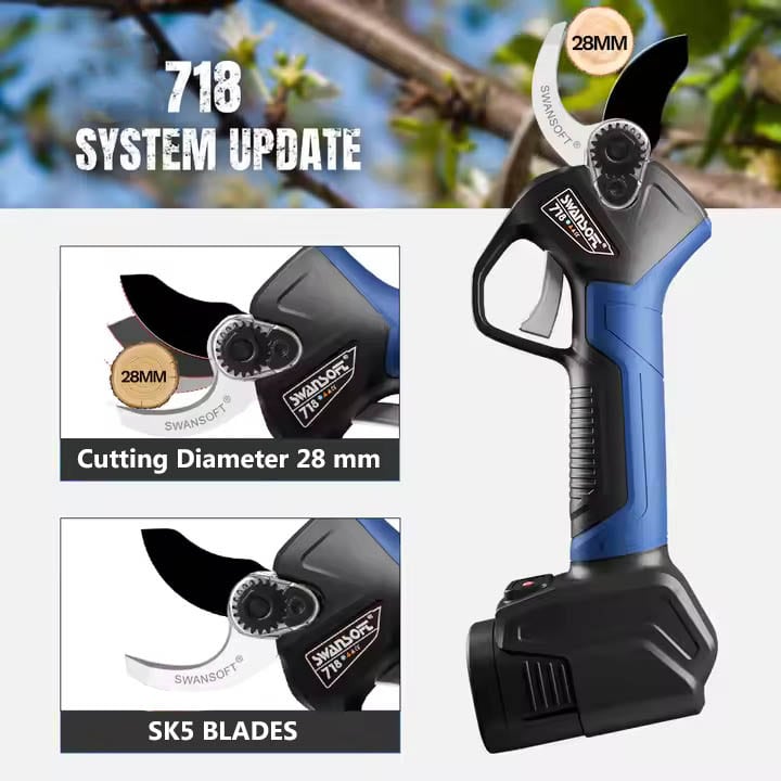 قیچی هرس شارژی SWANSOFT 718 (سوآن سافت) یکی از جدیدترین و سبکترین قیچیهای شارژی این برند معتبر است. این مدل با موتور بدون جاروبک (Brushless) 850 واتی طراحی شده که قدرت و دوام بالایی دارد و شاخههایی تا قطر 28 میلیمتر را به راحتی برش میدهد.